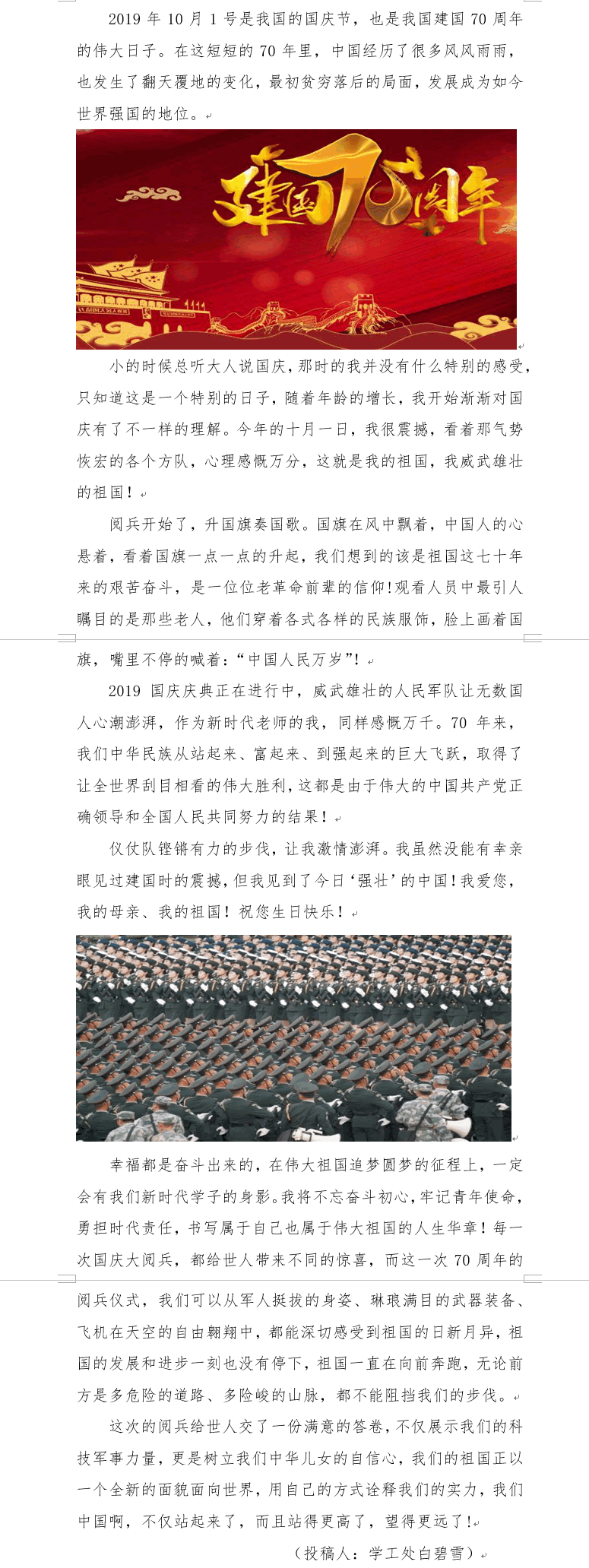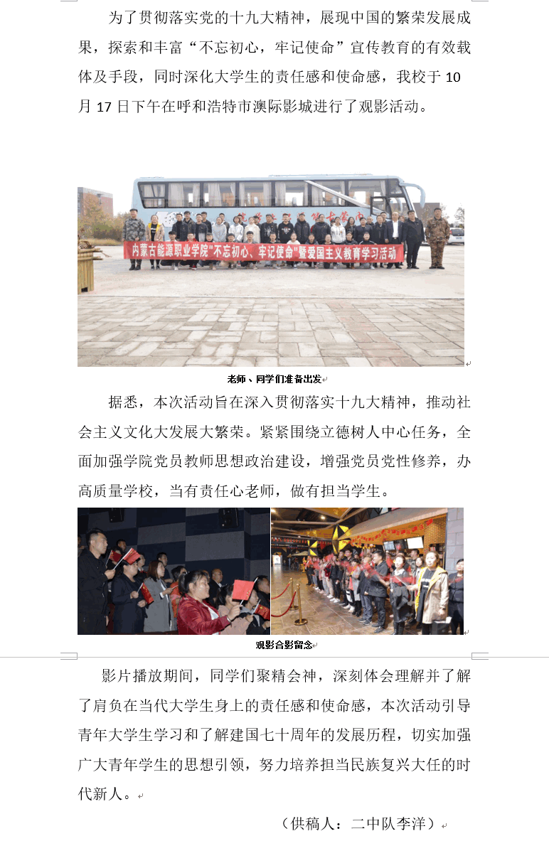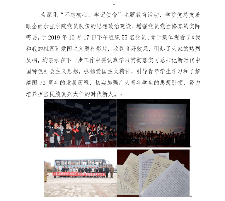 開展“不忘初心、牢記使命”主題教育,是新時代堅持和加強黨的全面領(lǐng)導(dǎo)、全面從嚴治黨、推進新的偉大工程的內(nèi)在要求。根據(jù)上級黨委部署及團市委要求,現(xiàn)制定我院“不忘初心,牢記使命”主題教育活動方案。學(xué)院將于2019年10月17日下午組織觀看獻禮70周年愛國主義教育影片《我和我的祖國》。一、活動目的:緊緊圍繞立德樹人中心任務(wù),全面加強學(xué)院黨員教師思想政治建設(shè),增強黨員黨性修養(yǎng),辦高質(zhì)量學(xué)校,當有責任心老師...