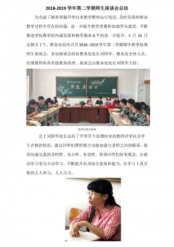 3月25日上午,教務(wù)處利用課間操時(shí)間,在教師休息室組織召開了任課教師座談會(huì),參加本次會(huì)議的有副院長(zhǎng)謝飛,教務(wù)處處長(zhǎng)劉國(guó)華和各位任課教師。會(huì)議由劉國(guó)華處長(zhǎng)主持。會(huì)上劉處長(zhǎng)對(duì)學(xué)院當(dāng)前的教學(xué)情況做了簡(jiǎn)要分析,鼓勵(lì)各位老師對(duì)學(xué)院的教學(xué)質(zhì)量提升工作積極建言獻(xiàn)策,希望老師們嚴(yán)格管理課堂紀(jì)律,并積極探索新的教學(xué)方式方法,激發(fā)學(xué)生學(xué)習(xí)興趣、活躍課程氣氛,改善課堂教學(xué)效果從而提高教學(xué)質(zhì)量。謝院長(zhǎng)向老師們介紹了當(dāng)前...